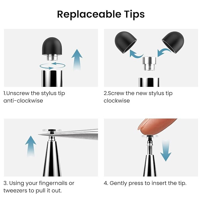 - 【Easy to Use & Replaceable】: No battery or bluetooth needed, simply unscrew the pen cap to use the disc tip and use dual rubber tips directly.2 tips are replaceable and finish the replacement process within seconds. Package contains 5* stylus, 8* replaceable rubber tips, 2* disc tips, effectively extending the lifetime of the stylus.
